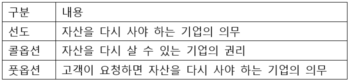 - 금융약정: 기업이 자산을 원래 판매가격 이상의 금액으로 다시 살 수 있거나 사야 하는 경우-이자 인식, 옵션이 행사되지 않은 채 소멸하면 부채를 제거하고 수익을 인식함